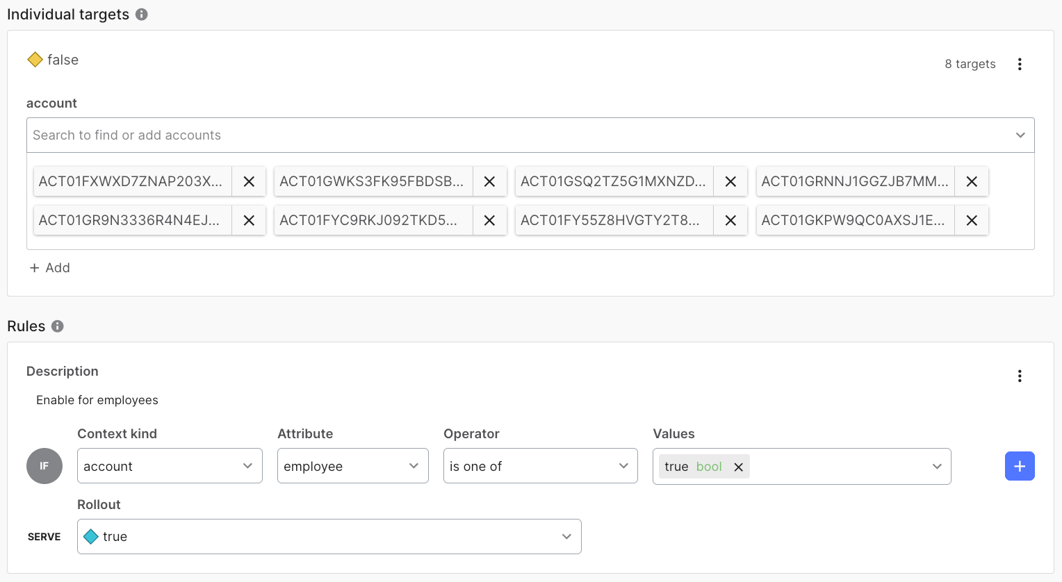 Check out the screenshot below of an actual feature flag we use in production. We are able to target specific accounts by specifying “Individual targets”, and we can target account segments by specifying “Rules”. For example, the rule below enables our feature flag for all of our employee accounts by matching on the employee attribute.