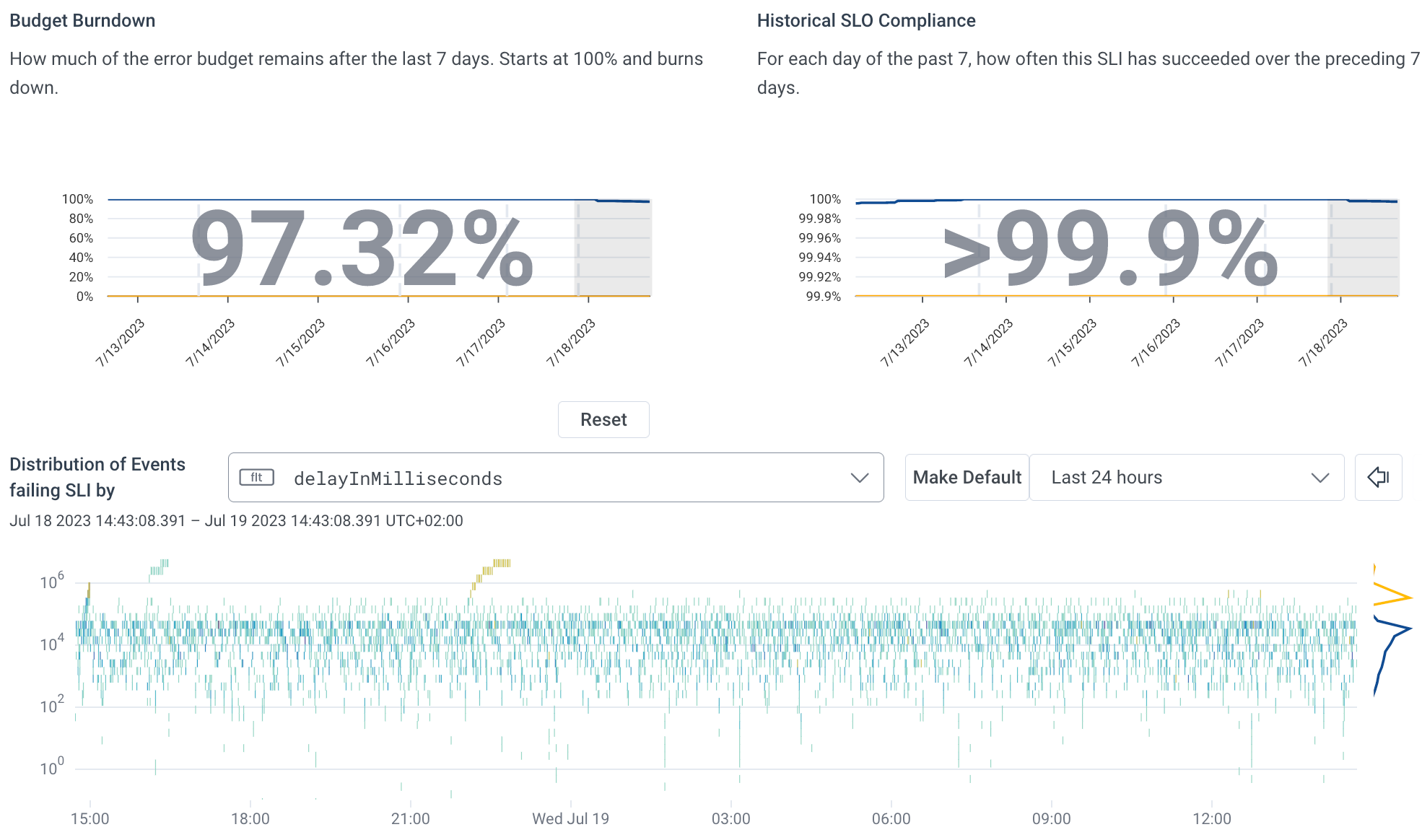 We send these traces to Honeycomb, and Honeycomb allows us to build SLOs and triggers that will alert us to issues in production. If a change in production introduces latency or increases our error rate, this triggers an incident and alerts our on-call engineer to roll back.