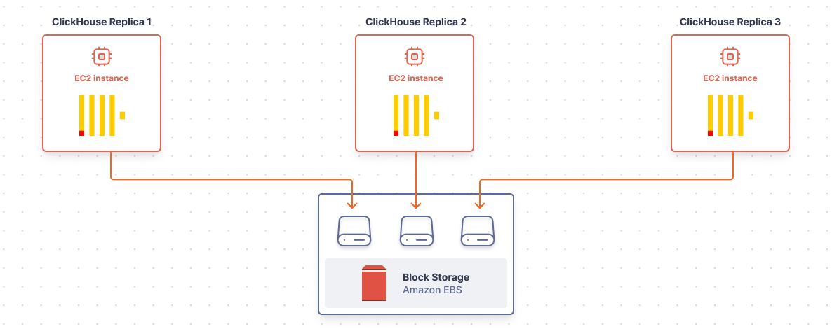 All the major cloud providers (AWS, GCE and Azure) offer durable block storage. For example, AWS’s offering, Elastic Block Storage (EBS), allows you to connect persistent disks over the network to your EC2 instances. These products offer both performance and durability. For performance, we can get more by paying for more IOPS and throughput. And durability means that, if our EC2 instance fails, the EBS volume still exists and can be attached to a new instance without data loss. For databases like ClickHouse, that mixture of performance and durability is critical, because (1) we want to answer queries quickly, and (2) once we’ve stored data, we never want to lose it.