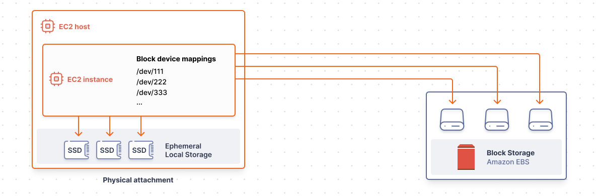 In addition to durable block and object storage, all the major cloud providers (AWS, GCE, and Azure) also offer ephemeral local storage. AWS calls these “instance store volumes”, and they are disks that are physically attached to the host computer. Depending on the EC2 instance type, the disks may be NVMe SSDs and perform faster than their EBS counterparts (remember, EBS volumes are attached over the network, while the instance store volumes are physically attached).