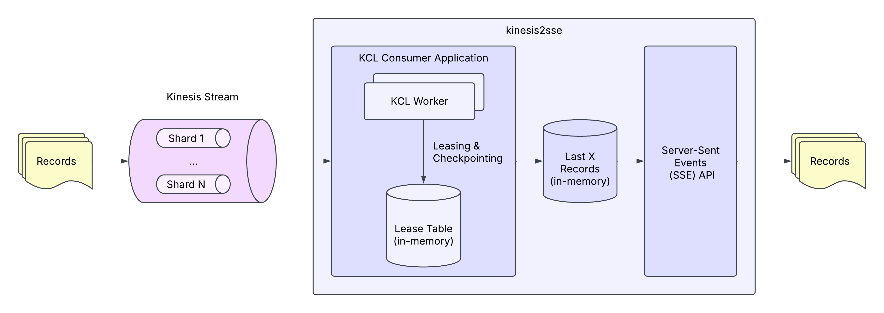 kinesis2sse differs from typical KCL consumer applications in that it doesn't aim for horizontal scalability. Instead, each instance subscribes to all shards of the stream in order to expose a complete set of records via SSE. For this reason, it doesn't need a lease table in DynamoDB; instead, it implements an in-memory Checkpointer:
