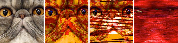 The leftmost image above shows the original image that produced the three derivative images. The first is a straight translation of the image using Sonify. The right two images were made by applying an LFO-controlled filter (think dubstep) and heavy reverb, respectively. Color frequency was mapped over 100‒1100 Hz, with a time-per-pixel of 10 ms.